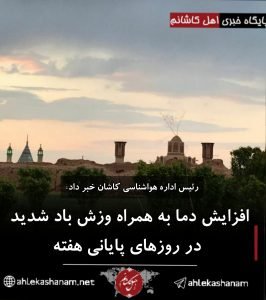 عباس ارغوانی در گفت و گو با پایگاه خبری اهل کاشانم با اشاره به ورود زودهنگام تابستان به منطقه کاشان اظهار داشت: در روزهای پایانی هفته جاری علاوه بر افزایش دما تا ۳۳ درجه سانتی گراد پیش بینی وزش باد شدید به همراه گردوخاک را در منطقه کاشان داریم.