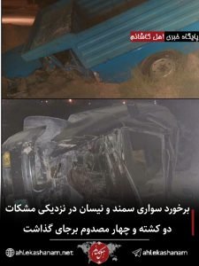 برخورد سواری سمند و نیسان در نزدیکی مشکات، دو کشته و چهار مصدوم برجای گذاشت