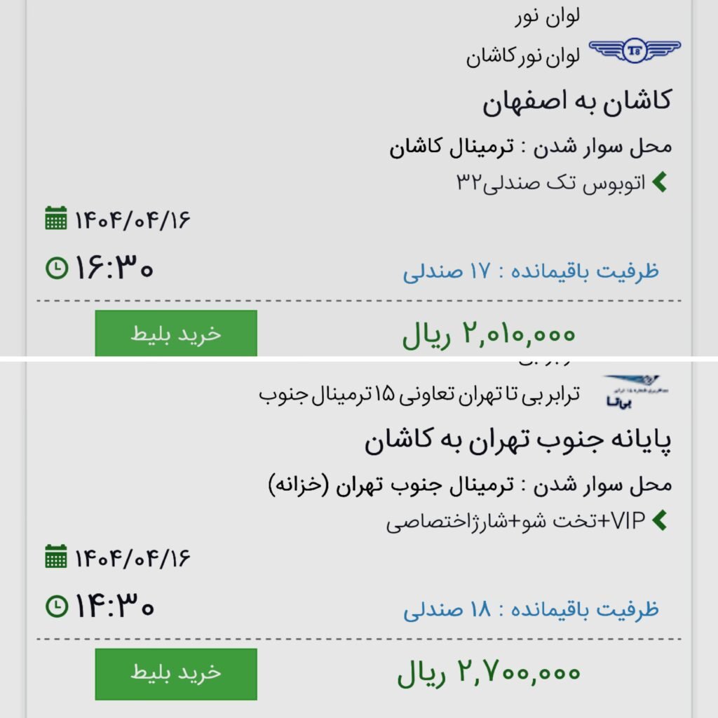 به عنوان نمونه، بهای بلیت مسیر کاشان – تهران به ۲۷۰ هزار تومان و کاشان – اصفهان به ۲۰۱ هزار تومان رسیده است؛ این در حالی است که در ماههای گذشته، قیمت این مسیرها به مراتب کمتر بوده است.