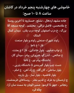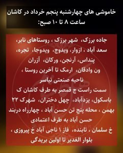 اداره برق کاشان جدول خاموشی در روز چهارشنبه پنجم خرداد را اعلام کرد.