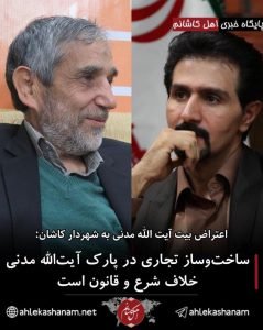 به گزارش پایگاه خبری اهل کاشانم مهدی مدنی و حسینعلی پورمدنی از طرف بیت آیت الله العظمی مدنی کاشانی و متولی اراضی پارک آیت الله العظمی مدنی طی یک نامه به شهردار کاشان با اشاره به اقدام شهرداری کاشان در ساخت یک مجموعه تجاری در زمینه ای وقفی پارک آیت الله مدنی کاشانی مراتب اعتراض خود را به این اقدام شهرداری کاشان ابراز داشتند.