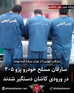 سارقان مسلحی که یک دستگاه خودروی پژو ۴۰۵ را از تهران سرقت کرده بودند در حین تردد در یکی از محورهای ورودی شهر کاشان دستگیر شدند.
