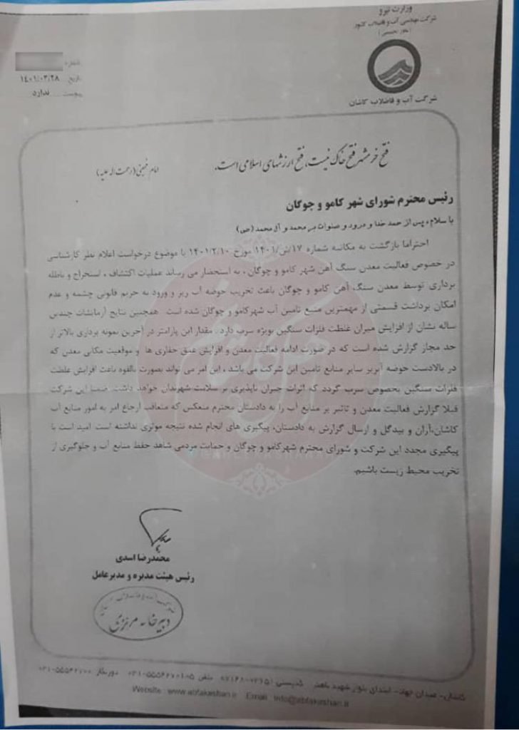 . در ادامه این نامه آمده است: این شرکت قبلا گزارش فعالیت معدن و تاثیر بر منابع آب را به دادستان محترم منعکس که متعاقب ارجاع امر به امور منابع آب کاشان وآران وبیدگل و ارسال گزارش به دادستان، پیگیری های انجام شده نتیجه موثری نداشته است.