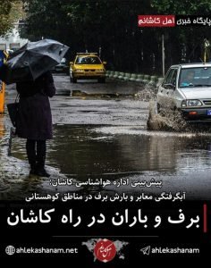 رئیس اداره هواشناسی کاشان کاهش دید افقی و یخبندان و لغزندگی جاده‌ها در مناطق کوهستانی را از جمله مخاطرات ذکر کرد و خاطرنشان کرد: به دلیل بار باران در مناطق دشتی احتمال آب گرفتگی معابر، اختلال در تردد و جاری شدن روان آب‌ها دور از انتظار نیست.