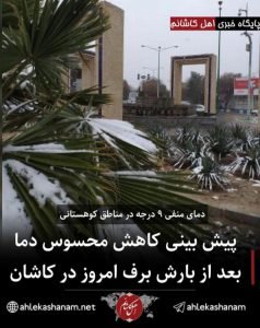 رئیس اداره هواشناسی کاشان با اشاره به اینکه پیش بینی می کنیم حداقل دمای دشت کاشان طی ساعات آینده تا منفی شش درجه سانتی گراد برسد، تصریح کرد: در مناطق کوهستانی هم کاهش دما تا منفی ۹ درجه سانتی گراد متصور است.