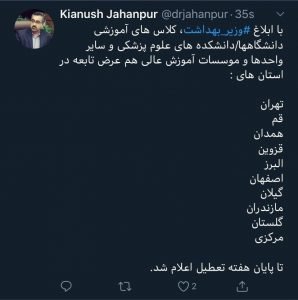 گفتنی است دانشگاه کاشان در اطلاعیه بعد از این ابلاغ وزیر بهداشت اعلام کرد: با توجه به اعلام وزارت بهداشت به منظور پیشگیری از شیوع بیماری کرونا و آرامش خاطــر شما دانشجویان عزیز دانشگاه کاشان تا پایان هفته جاری نهم اسفند ماه 1398 تعطیل می باشد.